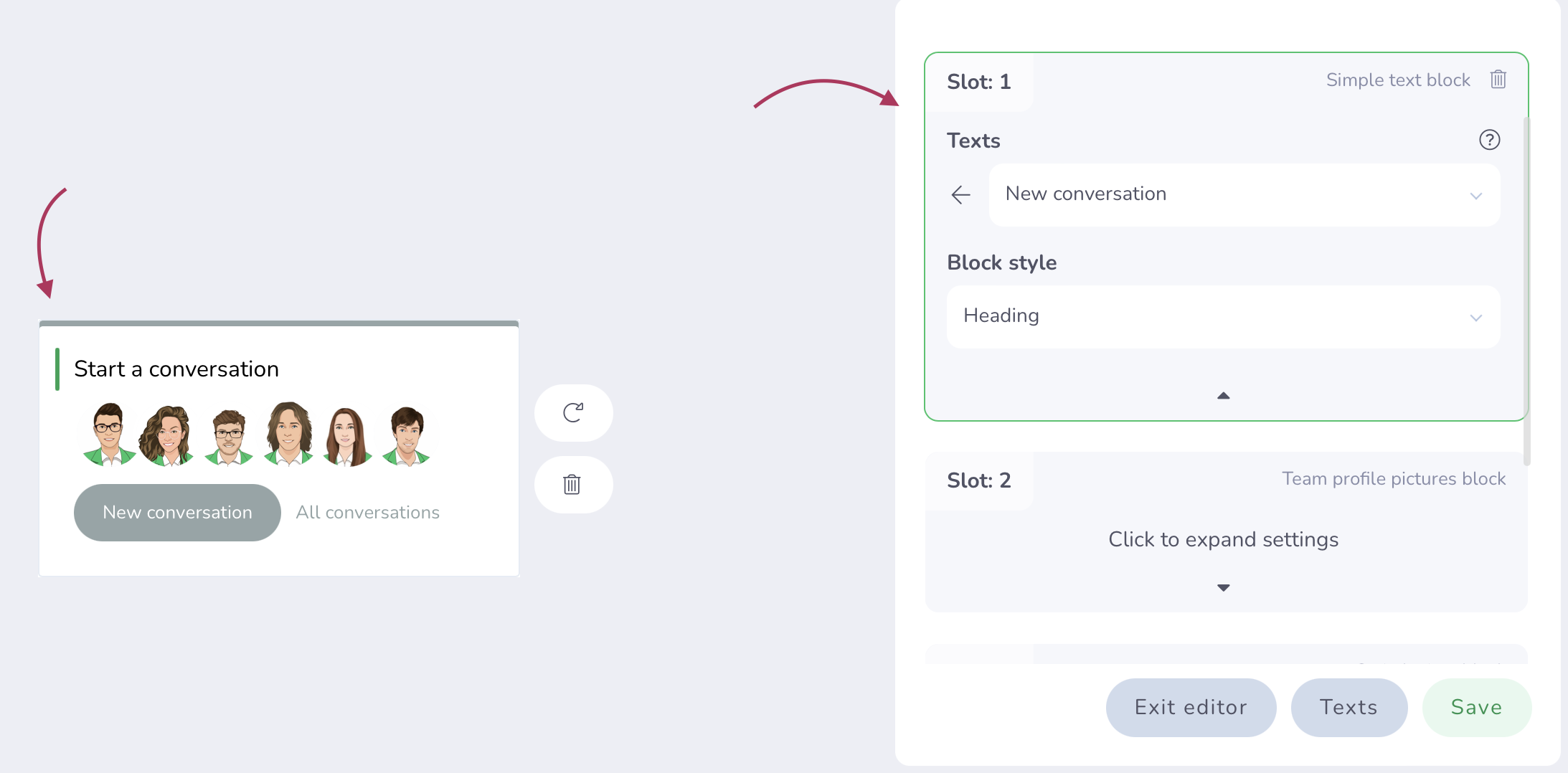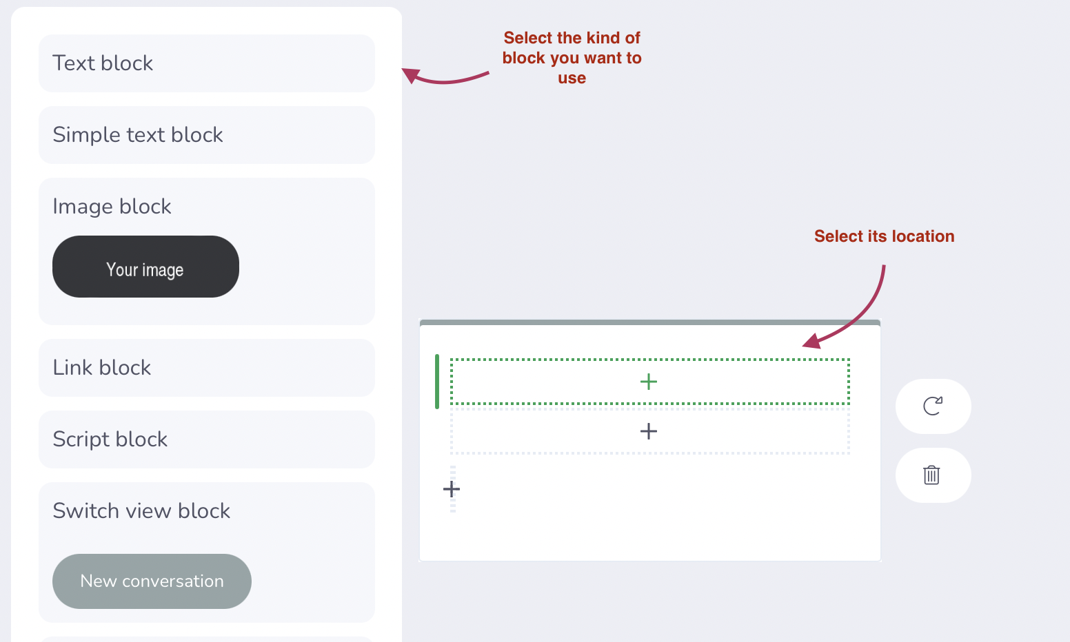 Once the style of the block has been chosen, all you have to do is enter its characteristics in the settings window. For example, if you have selected a block of text, you can define its format, its alignment, its style or even the text displayed.