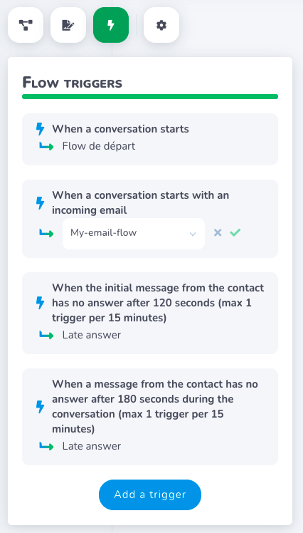 Moreover, Polaria lets you set up late answers triggers. These will start a specific flow if a contact's message, is left unanswered at the start or during a conversation.
